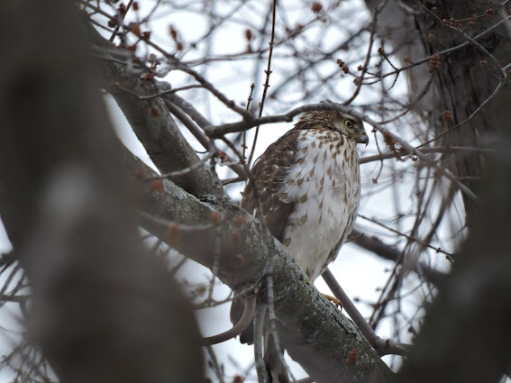 Then yesterday afternoon as I was once more rustling the branches of the family tree, 'there arose such a clatter, I arose from my couch to see what was the matter'. At first I thought that the blue jays were simply announcing their arrival, but there was a different urgency to these calls. It took a moment to realize that there was a Cooper's Hawk in the shrub. This I had never seen before.